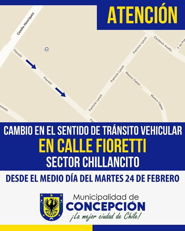 A partir del mediodía de este 24/02 la calle Fioretti, del sector de Chillancito de Concepción, cambia el sentido de tránsito entre las calles Camilo Henríquez y Patricio Lynch, con sentido único hacia Patricio Lynch.