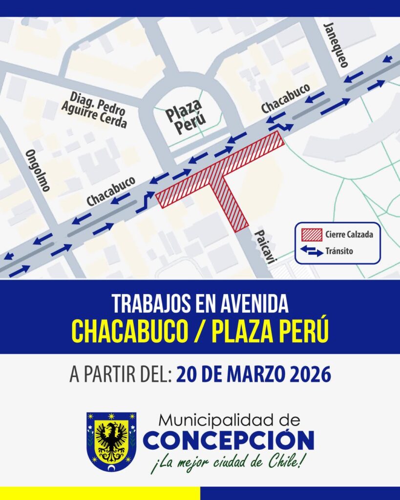 Desde la mañana de este viernes 20/03 se suspende el tránsito vehicular por la calle Paicaví, entre Víctor Lamas y Av. Chacabuco, frente a la Pinacoteca. Así como la calzada sur de la Av. Chacabuco, frente a la Plaza Perú de Concepción por trabajos del mejoramiento de la misma plaza. Se habilita la calzada norte de la Av. Chacabuco con bidireccionalidad solo en el tramo con obras. Y los desvíos de tránsito desde Víctor Lamas hacia Av. Chacabuco se pueden realizar por las calles Tucapel y Ongolmo hasta nuevo aviso municipal.