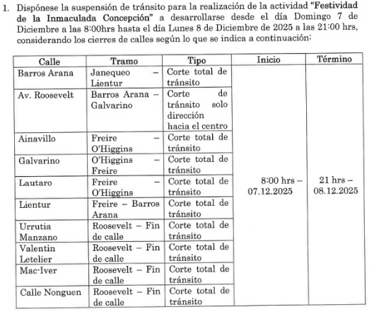 Este domingo 07/12 a partir de las 08:00 hrs. se suspende el tránsito vehicular en inmediaciones de la Plaza Juan Bosco de Concepción por actividad de la Inmaculada Concepción, hasta las 21:00 hrs. de este lunes 08/12.